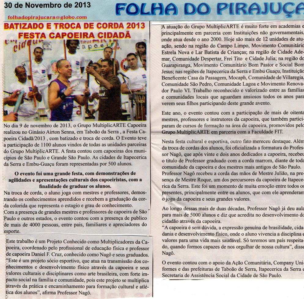 O Grupo MultiplicARTE realizou este grande Evento com o objetivo de graduar os alunos atendidos nas unidades parceiras, evento de grande expressão na região com participação de alunos, familiares e muitos profissionais da Capoeira, além de também acontecer a formatura a professor do coordenador e idealizador deste trabalho Daniel F. Cruz (Prof. Nagô). |